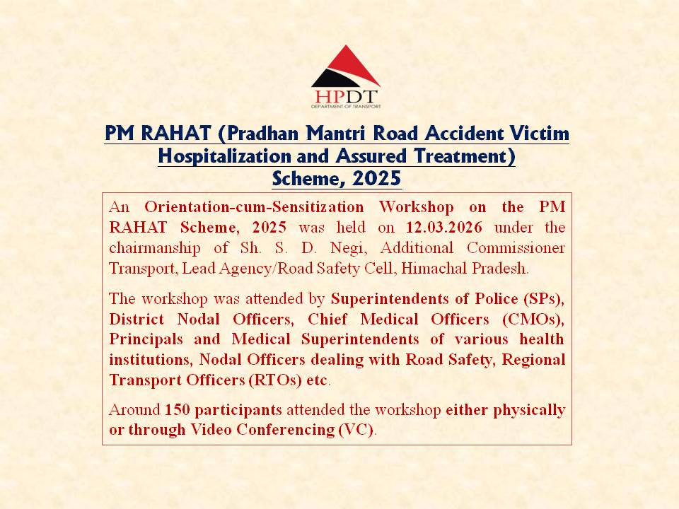 An Orientation - cum - Sensitization Workshop on the PM RAHAT Scheme, 2025 was held on 12.03.2026 under the chairmanship of Sh. S. D. Negi, Additional Commissioner Transport, Lead Agency/Road Safety Cell, Himachal Pradesh.